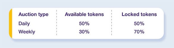 Daily auctions: 50% of the tokens acquired in the daily auctions will be available to the bidders at the end of the auction round. The remaining 50% will be locked for 12 months.